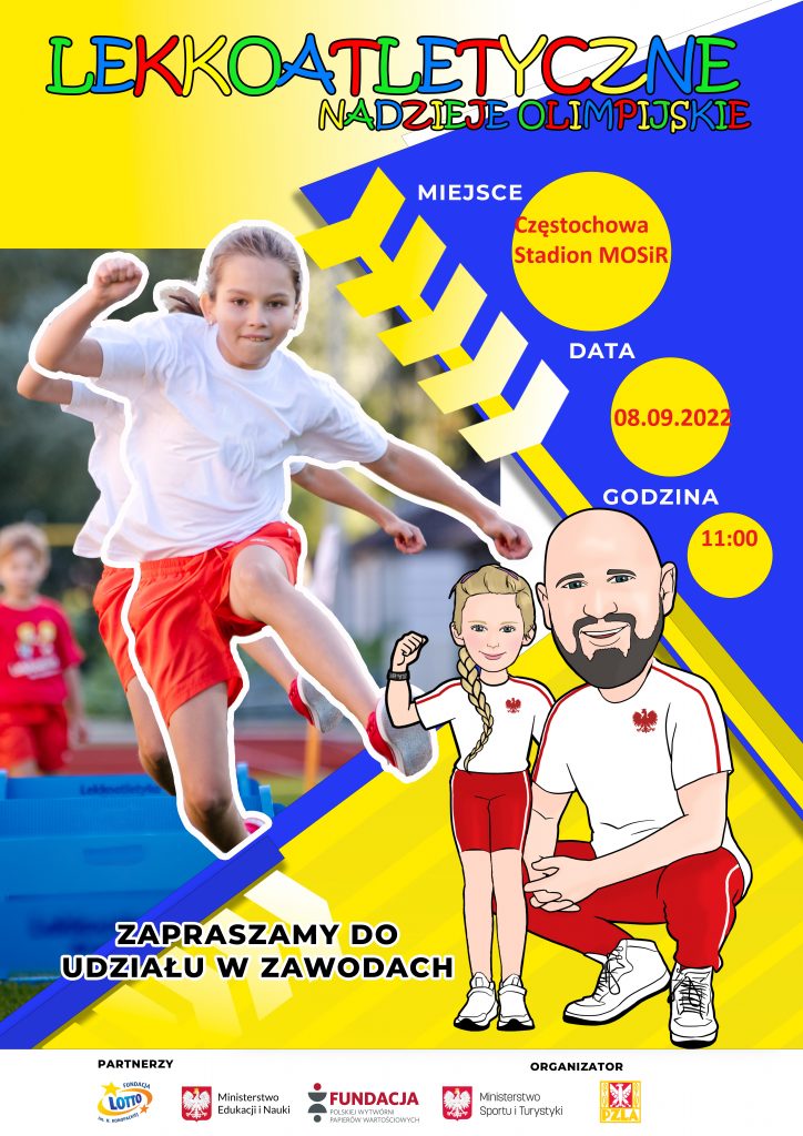 08.09 Częstochowa: Lekkoatletyczne Nadzieje Olimpijskie- zapraszamy ! 29 sierpnia 2022 Serdecznie zapraszamy do wzięcia udziału w zawodach- kategoria U12 szczegóły: https://szla.pl/dane/regulaminy/2022/Regulamin%20zawod%C3%B3w%20%20-%20Nadzieje%20Olimpijskie%20U12%20Cz%C4%99stochowa%20(1).pdf